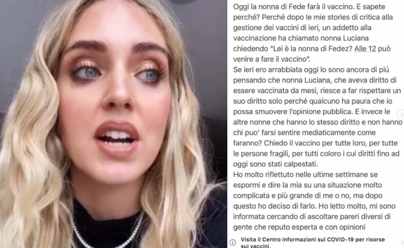 "Aveva diritto di essere vaccinata da mesi e riesce a far rispettare un suo diritto solo perché qualcuno ha paura che io possa smuovere l'opinione pubblica", dice l'imprenditrice digitale. "E invece le altre nonne che non hanno chi può farsi sentire mediaticamente come faranno?", dice la Ferragni, "Chiedo il vaccino per tutte loro, per tutte le persone fragili". E continua: "Vedere la Lombardia che fa un casino dietro l'altro è scoraggiante. Questo appello lo faccio a Mario Draghi e ancora di più a ogni singolo politico: basta chiacchiere, basta. Ora bisogna rimboccarsi le maniche".