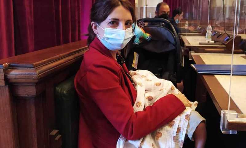 CAGLIARI. In consiglio comunale adesso c'è anche lo spazio per "posteggiare" una culletta per neonati. E la prima ad usufruirne è stata la rappresentante dei Progressisti Giulia Andreozzi, tornata in aula dopo un lungo periodo di sedute in streaming. E non era sola: con lei c'era anche il figlio Enrico, neonato.