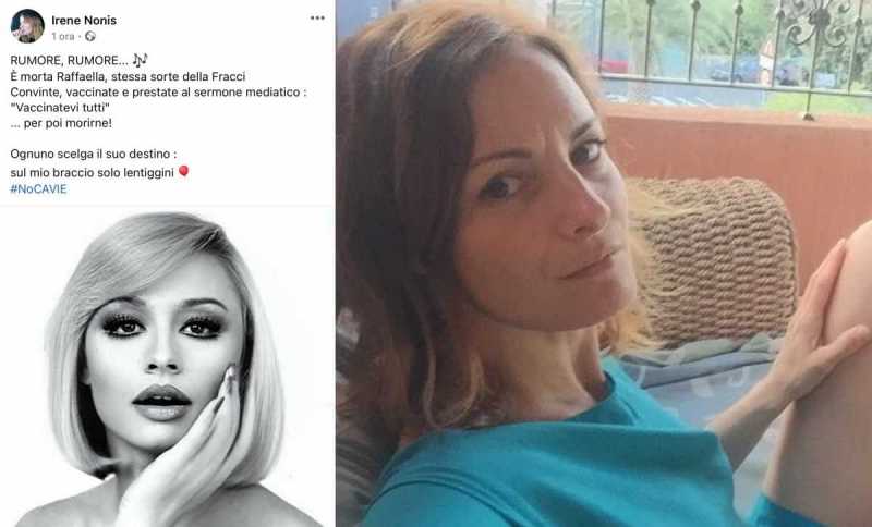 CAGLIARI. "Convinte, vaccinate e prestate al sermone mediatico". Raffaella Carrà e Carla Fracci, morte entrambe. "Vaccinatevi tutti, per poi morirne". È un post che ha fatto molto rumore quello della cantante cagliaritana Irene Nonis. Pubblicato, e poi cancellato dopo essere stata sommersa da una valanga di critiche. O, forse, solo oscurato a chi non la pensa come lei. Cioè a chi non crede, al contrario di quello che fa lei, che i due miti della televisione e della danza italiana (e mondiale) non siano morti perché avevano fatto il vaccino contro il Covid.