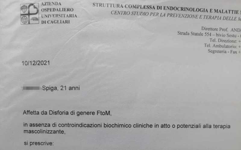 Su Twitter da tempo racconta i suoi pensieri e le sue paure, ma l'ultimo cinguettio, quello in cui mostra la foto della prescrizione medica dopo la visita nella struttura complessa di Endocrinologia, ha raccolto già un'enorme ondata di affetto e sostegno. "Affetta da Disforia di genere FtoM", si legge. E già il riconoscimento clinico è un importante passo. Poi la terapia che dovrà seguire fino al prossimo controllo, dopo 3 mesi. Sui social esplode di felicità: "Ce l'ho fatta". E nei commenti lo ringraziano "perché racconti pubblicamente la tua esperienza".
