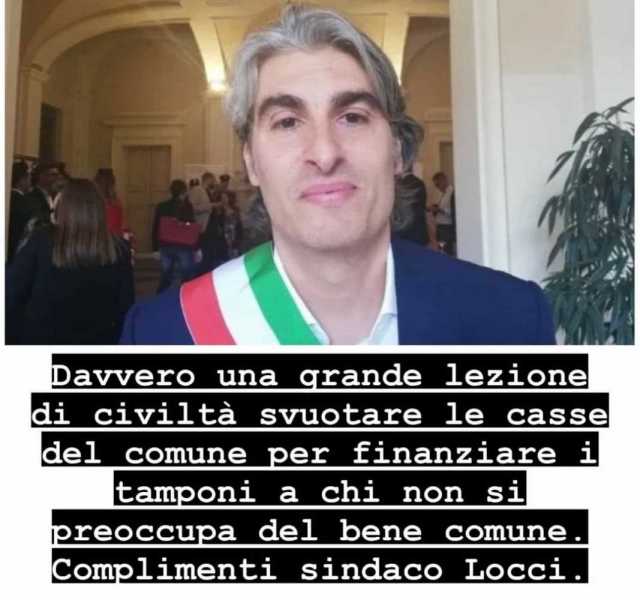 La Lucarelli, citando la notizia riportata da una testata locale, che spiega come il primo cittadino vuole aiutare i lavoratori no vax a non spendere 200 euro al mese, scrive: "Davvero una grande lezione di civiltà svuotare le casse del Comune per finanziare i tamponi a chi non si preoccupa del bene comune. Complimenti".