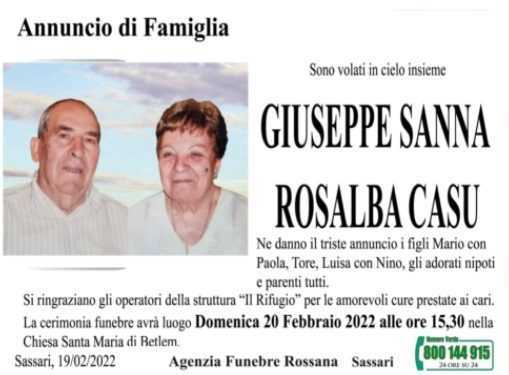SASSARI. "Sono volati in cielo insieme". Sono le parole scelte per l'annuncio funebre redatto dai figli di Giuseppe Sanna, 88 anni, e Rosalba Casu, 79: marito e moglie che dopo 60 anni di matrimonio sono morti nello stesso giorno, a poche ora di distanza l'una dall'altro. Lui se n'è andato al mattino presto, lei lo ha raggiunto 12 ore dopo.