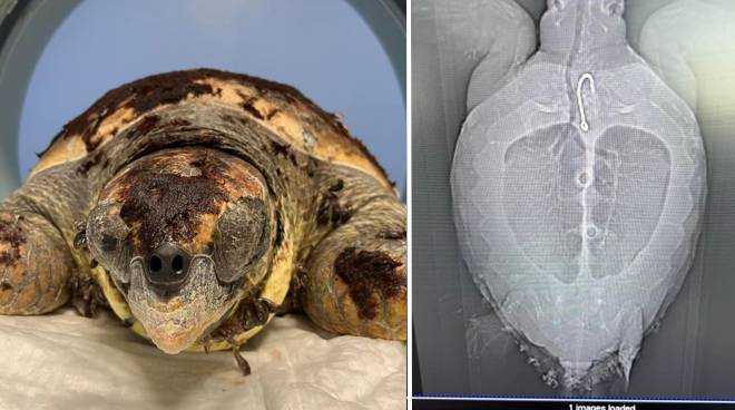 ARBATAX. “Oggi è arrivata in clinica una Caretta recuperata da un diportista al largo di Arbatax. Una lenza di almeno tre metri fuoriesce dalla cloaca e c'è un grosso amo da palamito di circa 10 centimetri nel suo esofago”. Le foto della tartaruga, con tanto di radiografia, arrivano dalla clinica veterinaria Duemari, che ha lanciato un appello ai pescatori.