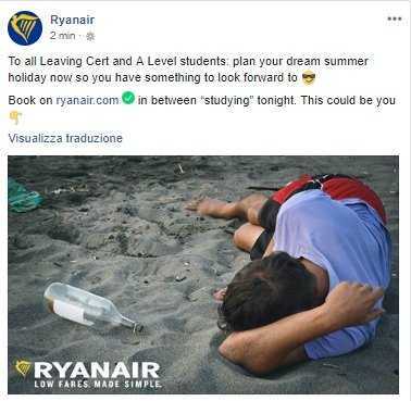 CAGLIARI. Dovrebbe essere un invito rivolto agli studenti affinché organizzino le vacanze dei loro sogni al più presto. Si è trasformato in un boomerang. L'ultimo spot di Ryanair in pochi minuti ha fatto scatenare numerose reazioni indignate. "Prenota le tue vacanze, tu potresti essere questo", dice il testo. E la foto è quella di un giovane che si gode il sole o le montagne? No: è ritratto un ragazzo ubriaco fradicio addormentato sulla spiaggia. Il primo commento? ""Se i dream summer holidays sono essere addormentati ubriachi ( cosa che fa pensare la bottiglia vuota accanto) meglio non averli".