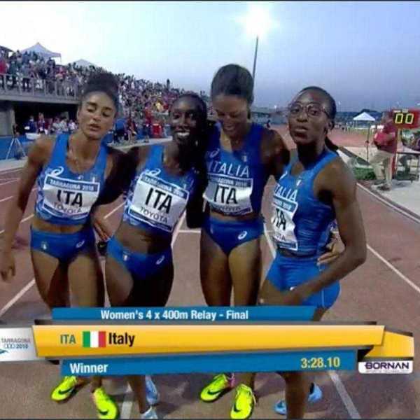 TARRAGONA. Si chiamano Maria Benedicta Chigbolu, Ayomide Folorunso, Raphaela Lukudo e Libania Grenot (campionessa europea): hanno la pelle nera ma sono loro ad aver fatto trionfare l'Italia nella staffetta 4X400 donne ai Giochi del Mediterraneo di Tarragona. Con un tempo di  3'28"08 hanno conquistato l'oro.