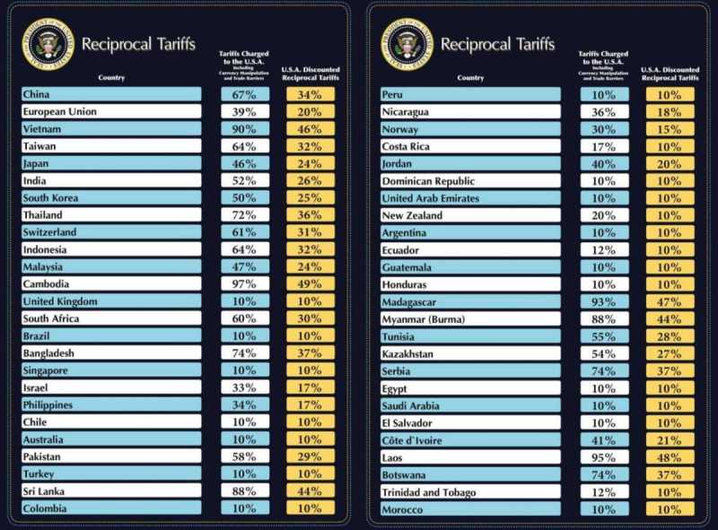 Stesso schema del 50% della reciprocità anche per altri Paesi, tra cui: 10% al Regno Unito, 34% per Cina, 24% Giappone, 46% Vietnam, 32% Taiwan, 10% Brasile.