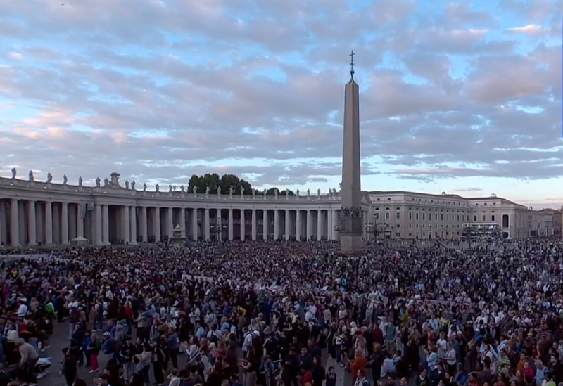 Sui maxi schermi installati è apparso il comignolo posto sul tetto della cappella Sistina. San Pietro è piena di fedeli e pellegrini: tutti con gli occhi puntati sul comignolo della Cappella Sistina in attesa del successore di Pietro.