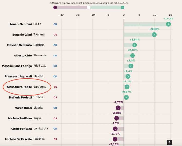 Todde è quindi settima per l'aumento del consenso, ma occupa il 15esimo posto nella lista dei presidenti di Regione per la percentuale di consensi in termini assoluti: è tra i cinque governatori che si fermano sotto il 50%.
