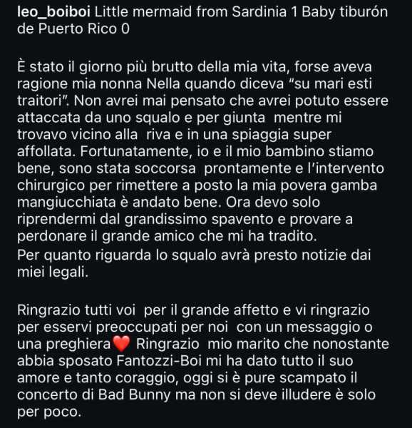"Come diceva mia nonna 'su mari esti traitori', ma io e il mio bambino stiamo bene e l'intervento chirurgico per rimettere a posto la mia gamba mangiucchiata è andato bene" ha commentato la sarda sui social, spiegando come ora ci sia solamente "da riprendersi dal grande spavento.