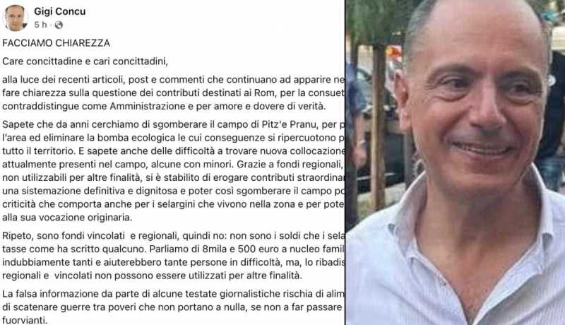 SELARGIUS. “Grazie ai fondi regionali, vincolati, e quindi non utilizzabili per altre finalità, si è stabilito di erogare contributi straordinari ai Rom per trovare una sistemazione definitiva e dignitosa. Quindi no: non sono i soldi che i selargini pagano con le tasse come ha scritto qualcuno". Con queste parole in un post su Facebook il sindaco di Selargius Gigi Concu chiarisce la questione sui fondi destinati alle famiglie Rom. Sono stati infatti stanziati nei giorni scorsi 8.500 euro per ciascun nucleo familiare, dando modo alle famiglie di trovare un’occupazione e sgomberare il campo Pitz’e Pranu.
