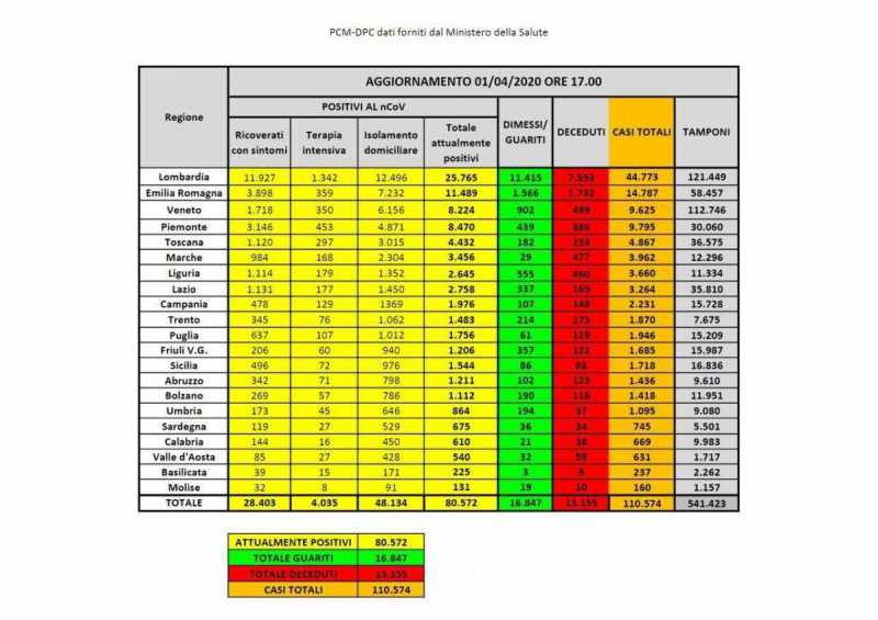 I contagiati in Italia secondo il bollettino di ieri, 1 aprile 2020