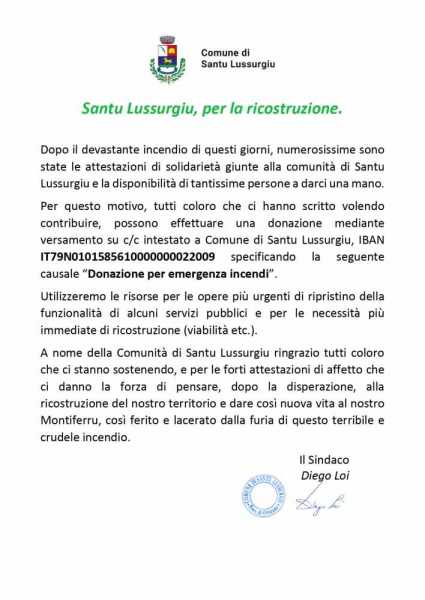 Il Comune di Santu Lussurgiu intanto ha attivato un conto corrente per le donazioni. Tutti i dettagli sotto.